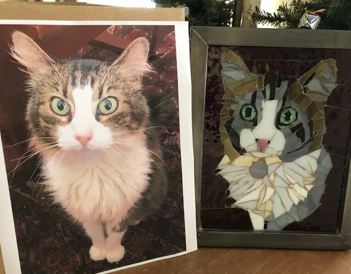 My first cat I tried to accomplish was very difficult. Her eyes were a bright yellow with beautiful white fur. Trying to use white grout was interesting. It’s fun to look back at my original art and see how far I’ve come!