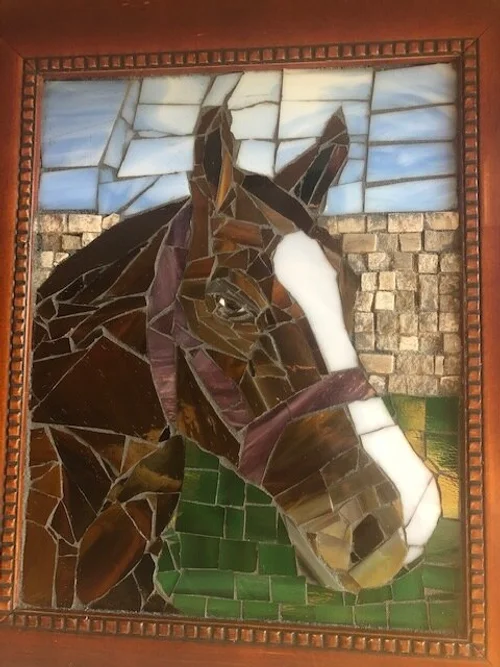 Look to the far left on a shelf is “Riley.” I enjoyed surprising the owner with a mosaic. Sadie here in the photo is the owner’s current dog. I love the heart in her forehead. RIP sweet Riley.