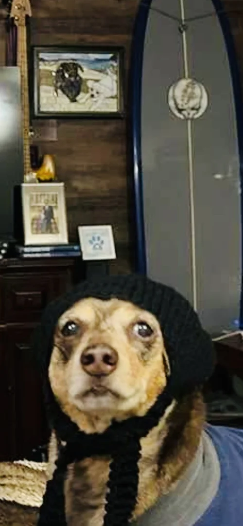 Lava loves to go on walks, trips, and exploring the avocado orchards. He now sits at the piano with all the family photos.